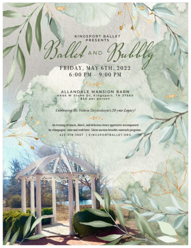 Kingsport Ballet’s Ballet and BubblyApril 28, 2022Tickets are $50 per person, call the Kingsport Ballet at 423-378-3967 https://www.allandalemansion.com/wp-content/uploads/KB_BandB_8.5x11Flyer-2022-800x1036-1.jpg 800 618 Jennifer Henry /wp-content/uploads/allandale.png Jennifer Henry2022-04-28 15:29:502022-07-01 09:23:56Kingsport Ballet’s Ballet and Bubbly